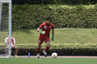 | 前半終了間際に相手CK 緊張が走りますが、落ち着いて弾き出します |
